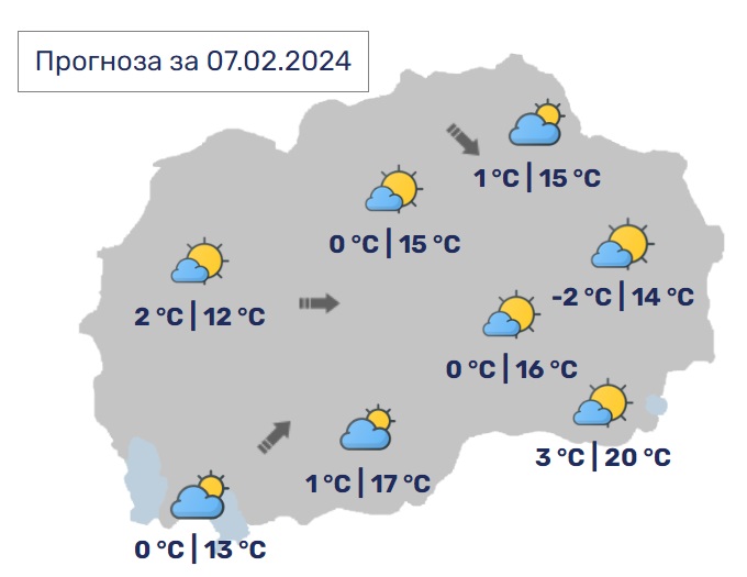 Утре наутро ќе има услови за утринска магла по одделни котлини. Преку денот сончево и топло со мала до умерена облачност. Ќе дува слаб југозападен ветер.