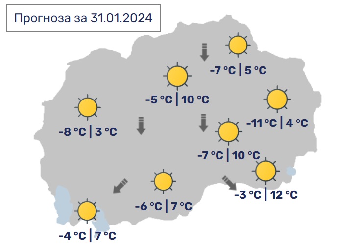Утре наутро ќе биде студено, по одделни котлини со услови за појава на утринска магла. Преку денот сончево со мала облачност кој во вечерните часови ќе се зголемува. Ќе дува слаб променлив ветер.