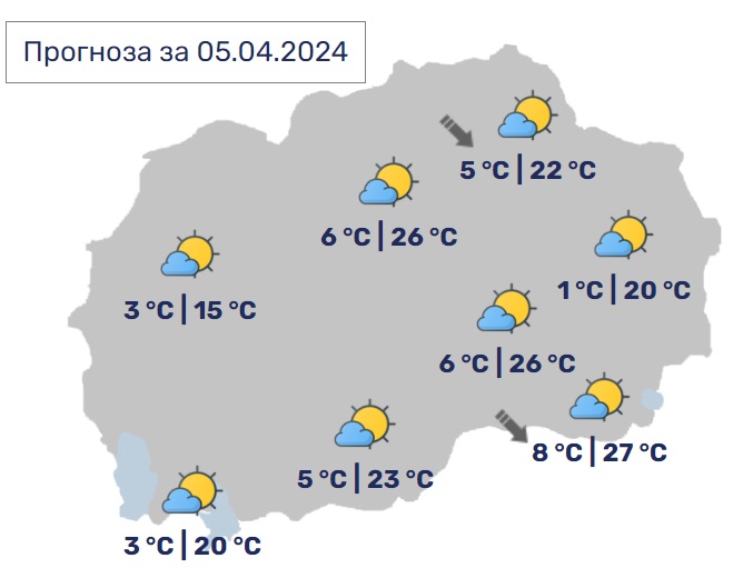 Утре времето во Македонија ќе биде сончево со мала локална облачност. Ќе дува слаб до умерен ветер од северозападен правец.