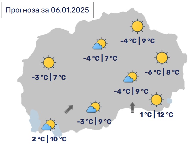 Утре времето ќе биде променливо облачно, претпладне со магла по одделни котлини. Кон крајот на денот и во текот на ноќта во западните делови ќе има слаби врнежи од дожд. Ќе дува слаб до умерен ветер од јужен правец. Минималните температури ќе се движат од -3 до 4, а максималните од 7 до 13 Целзиусови степени.