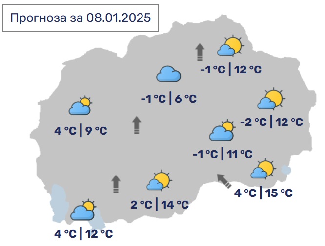 Минималната температура ќе се движи од -2 до 4, а максималната од 8 до 15 Целзиусови степени.