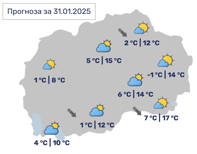 Утре времето ќе биде сончево и релативно топло со мала до умерена локална облачност. Претпладне по одделни котлини ќе има појава на магла. Минималните температури ќе се движат од -3 до 6, а максималните од 9 до 17 Целзиусови степени.