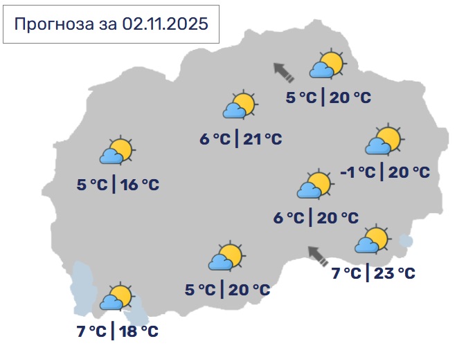 Во Скопје претпладне во делови од котлината ќе има слаба маглa, а преку денот ќе биде сончево со мала до умерена облачност. Ќе дува слаб ветер од југоисточен правец. Минималната температура ќе се спушти до 6, а максималната ќе достигне до 21 Целзиусов степен.