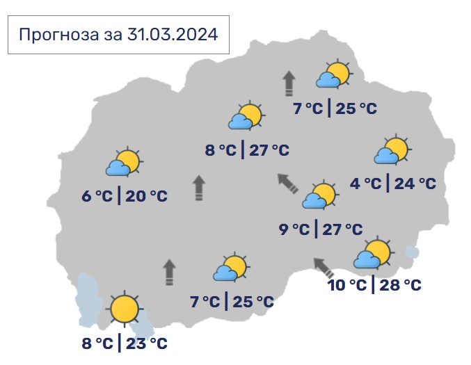 Времето во Македонија денеска ќе биде сончево и топло со мала локална облачност. Ќе дува слаб до умерен ветер од јужен правец, поизразен долж Повардарието.