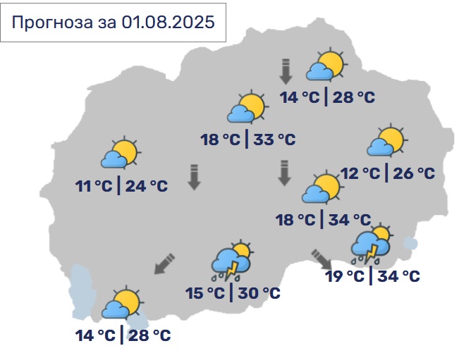 Во Скопје ќе биде сончево со мала до умерена облачност. Ќе дува слаб до умерен ветер од северен правец. Минималната температура ќе се спушти до 18, а максималната ќе достигне до 33 степени Целзиусови.