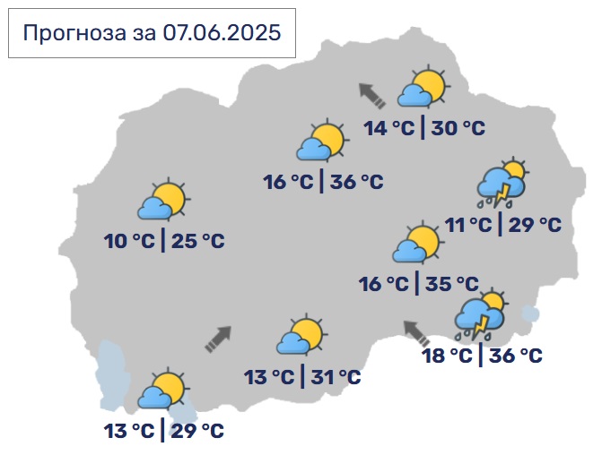Во Скопје, сончево и многу топло со мала до умерена облачност. Ќе дува слаб со умерен ветер од јужен правец. Дневните температури ќе достигнат до 37 Целзиусови степени.