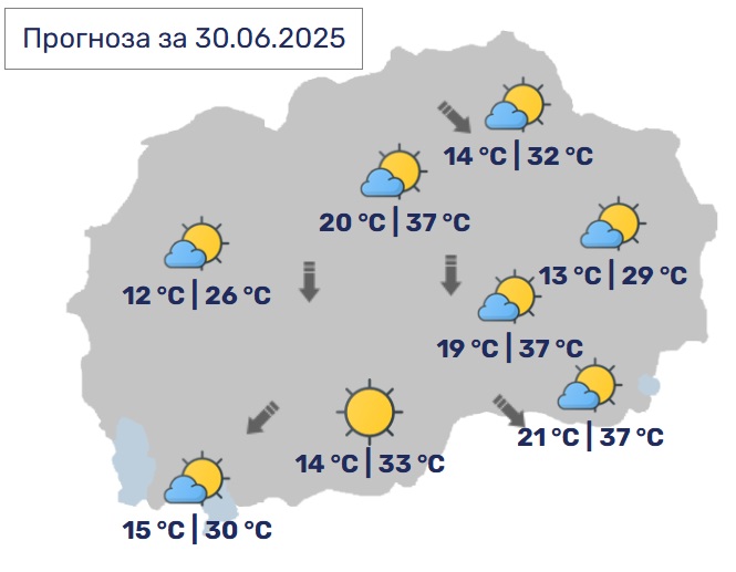 Во Скопје, слично време со минимална температура која ќе достигне до 20-тиот степен и максимална температура до 37 степени.