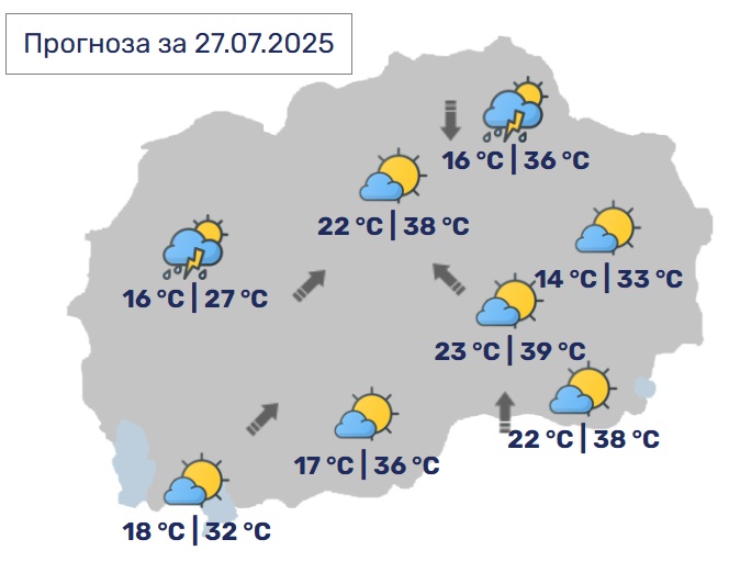 Во Скопје, сончево и многу топло, попладне со умерен развој на нестабилна облачност. Во делови од котлината ќе има услови за краткотраен дожд и ретки грмежи. Ќе дува слаб до умерен ветер од југозападен, а кон крајот на денот од северен правец.