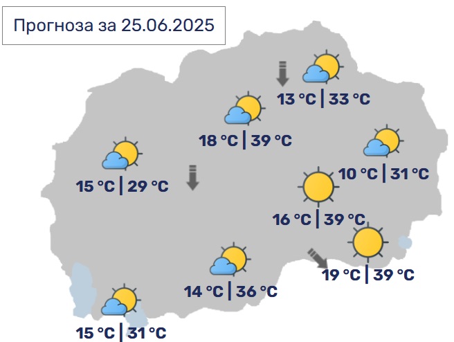 Во Скопје, сончево и многу топло со слаб ветер од северен правец. Минималната температура ќе се спушти до 18, а максималната ќе достигне до 39 степени.