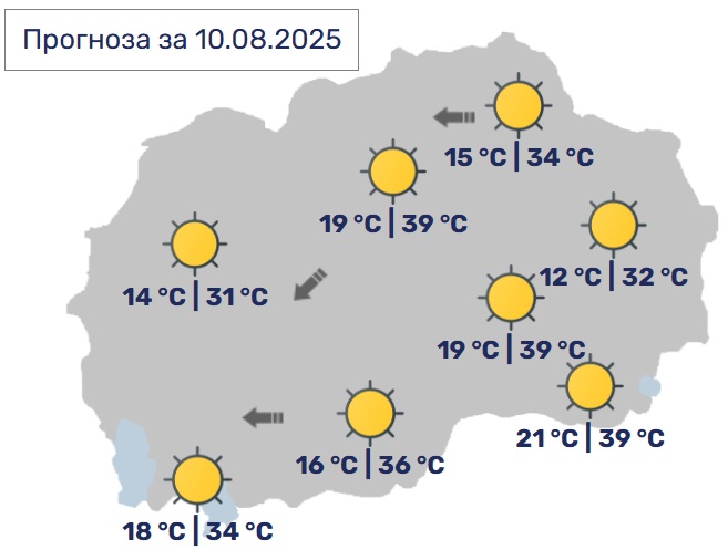 Минималната температура ќе биде во интервал од 12 до 21, а максималната ќе достигне од 32 до 39 Целзиусови степени.