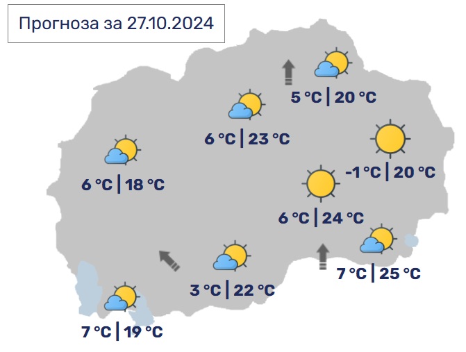 И утре наутро по одделни котлини ќе има услови за појава на магла. Преку денот претежно сончево со слаб до умерен ветер од северозападен правец. Дневните температури ќе се движат од 18 до 26 Целзиусови степени.