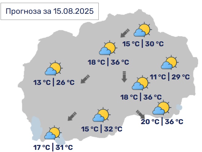 Утре времето ќе биде сончево и топло со умерена облачност. Попладне во планинските региони ќе има услови за изолирана појава на нестабилност со краткотраен пороен дожд и грмежи. Ќе дува слаб до умерен ветер од североисточен правец. Дневните температури ќе достигнат до 38 Целзиусови степени.