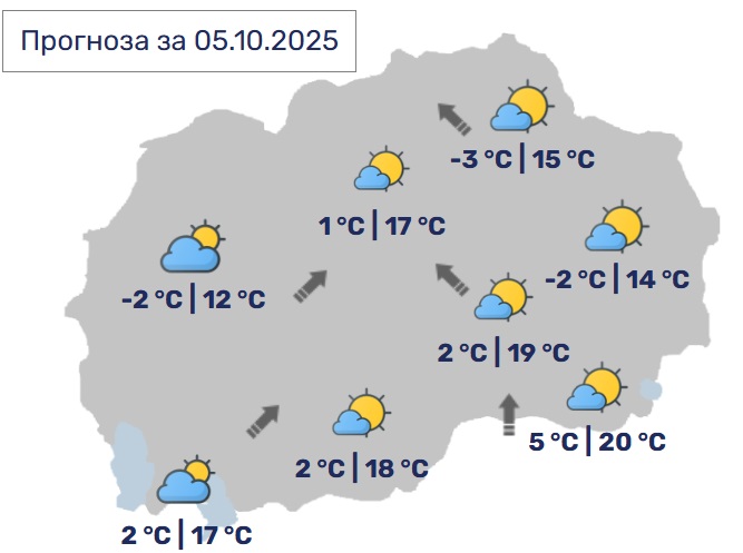 Утре времето ќе биде променливо облачно со повремени локални врнежи од дожд и дневни температури од 9 до 16 Целзиусови степени. Ќе дува умерен до засилен ветер од северен правец.