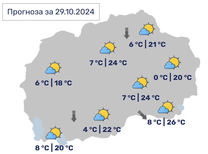 Во Скопје наутро со услови за слаба магла, а преку денот сончево со умерена облачност. Ќе дува слаб ветер од северен правец. Минималната температура ќе се спушти до 7, а максималната ќе достигне до 24 степени.