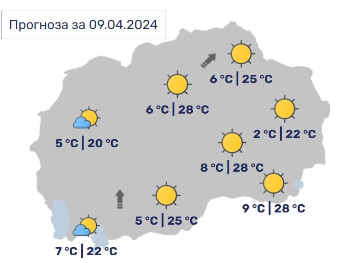 Продолжува периодот на сончево и топло време со појава на мала до умерена локална облачност. Од четврток ќе дува умерен ветер од северен правец.