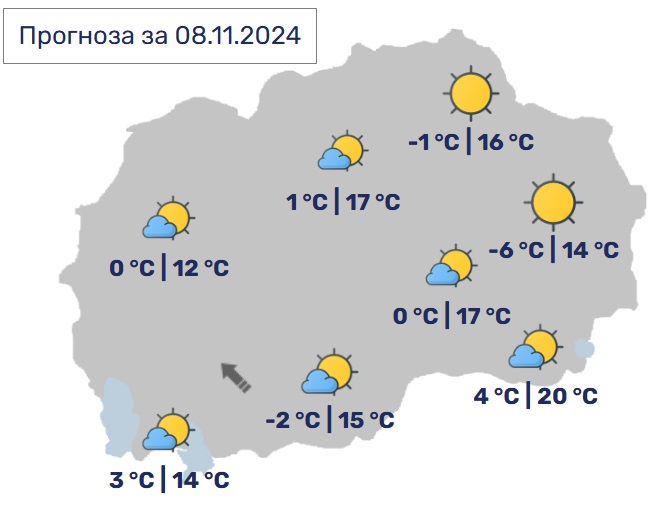 И утре утрото ќе биде студено со услови за појава на магла по одделни котлини. Во текот на денот времето ќе биде сончево со мала до умерена локална облачност. Ќе дува слаб до умерен ветер од северен правец. Утринските температури ќе се движат од -5 до 3, а дневните од 13 до 20 Целзиусови степени.