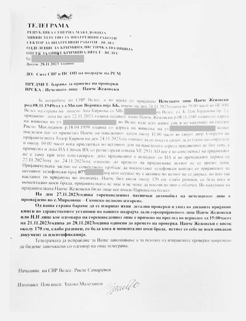 Ова е телеграма од СВР Велес до сите СВР на територија на Македонија, а во која се нотира дека лицето Панче Жежовски заедно со својот автомобил, а тоа е автомобилот со кој била киднапирана Вања, е пријавен за исчезнат од страна на член на неговото семејство на 24 ноември.