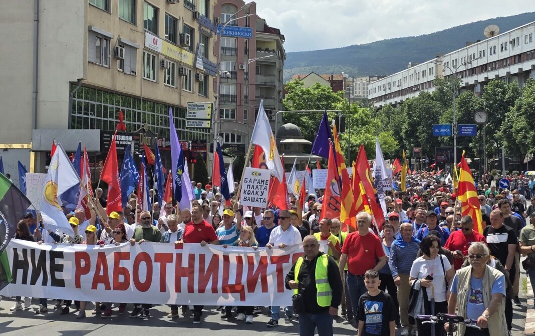 „Денеска сме тука да им кажеме на тие што ќе седнат во удобните фотељи дека не може да се одлучува за нас, без нас, дека ние работниците бираме и потоа очекуваме од нив да ги почитуваат нашите барања. Да им порачаме да не се грижат само за себе, да не го злоупотребуваат европското знаменце кога е на штета на работниците, а за 24 часа да се изгласаат 78 проценти зголемени плати, тие да уживаат, а ние да патиме“, истакна Трендафилов.