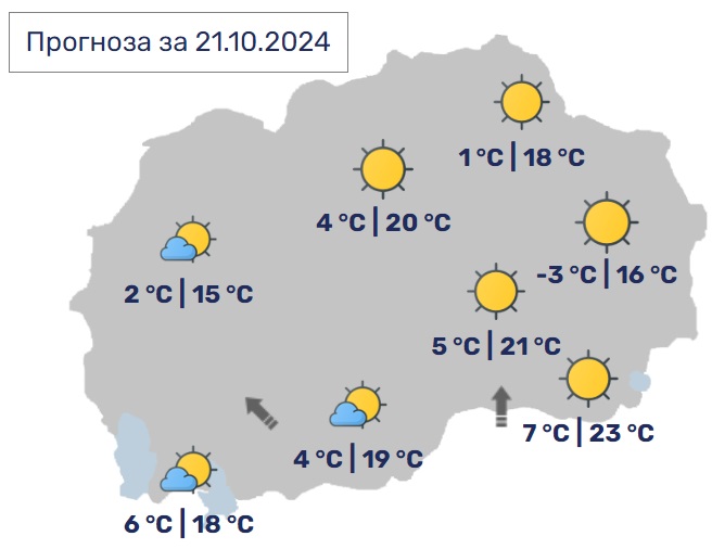 И утре наутро времето ќе биде студено, а преку денот претежно сончево. По одделни котлини ќе има услови за појава на утринска магла или ниска облачност. Ќе дува слаб ветер од јужен правец. Дневните температури ќе се движат од 17 до 23 Целзиусови степени.