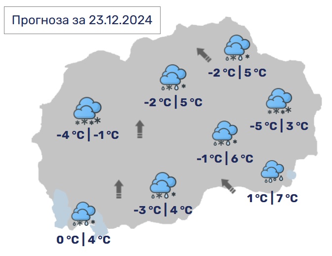 Утре времето ќе биде променливо облачно и студено со повремени локални врнежи од снег, особено во северните делови. Ќе дува умерен до засилен ветер од северен правец. Дневните температури ќе се движат од 0 до 6 Целзиусови степени.