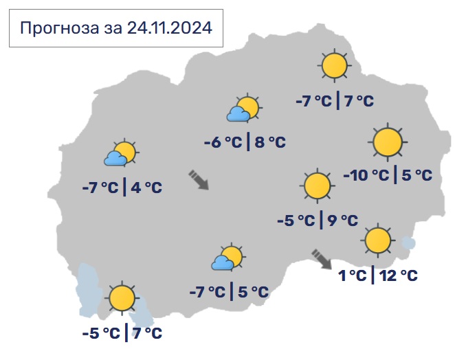 Според најавите од Управата за хидрометеоролошки работи (УХМР), следува период на стабилно време со ниски утрински температури кои до средината на оваа седмица насекаде ќе бидат негативни, а наместа ќе се спуштат и под -10 степени. Дневните температури ќе бидат во пораст. По одделни котлини ќе има појава на магла или ниска облачност.