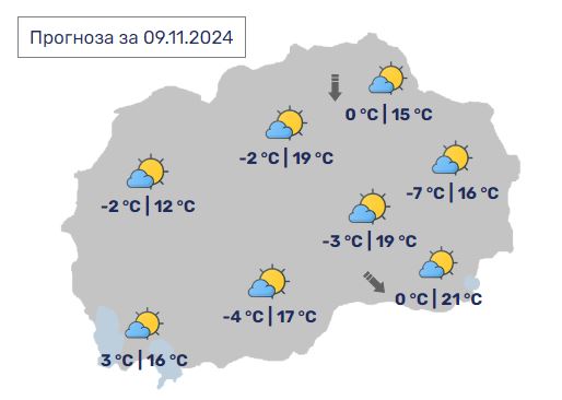 Во Скопје утрото ќе биде студено со појава на магла во делови од котлината. Преку денот сончево со мала локална облачност и со слаб северен ветер. Минималната температура ќе се спушти до -2, а максималната ќе достигне 19 степени.
