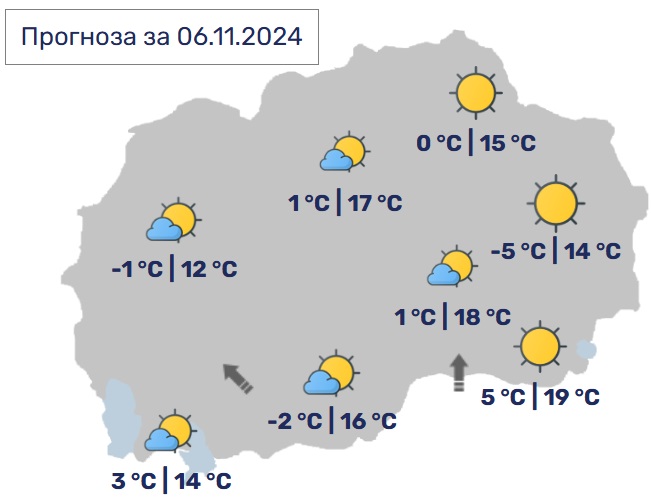 Утрата ќе бидат студени со минимални температури кои на повеќе места ќе се спуштаат под нула степени. По котлините ќе има појава на магла или ниска облачност, која по одделни котлини ќе се задржи и во текот на денот, информира Управата за хидрометеоролошки работи.