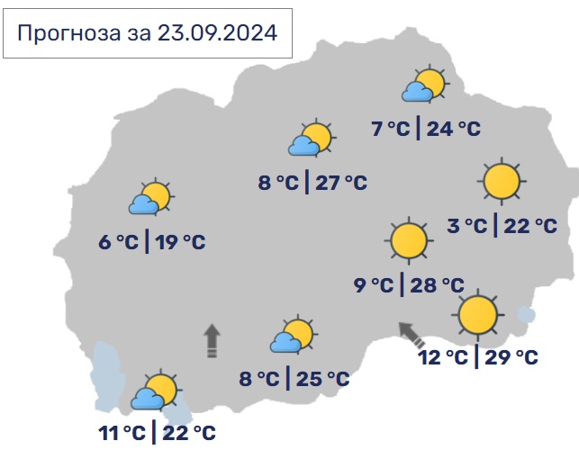 Во Скопје се очекува утрото да биде посвежо, а преку ден сончево и релативно топло. Минималната температура ќе се спушти до 8, а максималната ќе достигне до 27 степени.