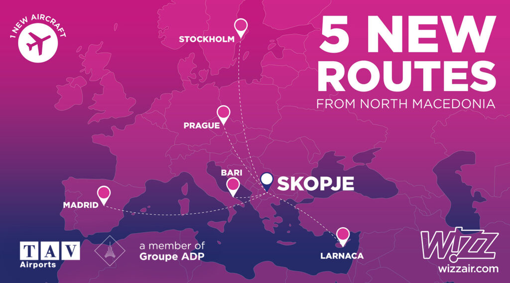 ТАВ Македонија, подружница на ТАВ аеродроми, аеродромскиот оператор на Меѓународниот аеродром Скопје и аеродромот Св. Апостол Павле Охрид, најави нови директни авиолинии до главни европски дестинации: Стокхолм (Шведска), Бари (Италија), Мадрид (Шпанија), Прага (Чешка), Келн (Германија) и претходно најавената Ларнака (Кипар), на кои ќе сообраќа Визер.