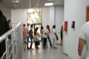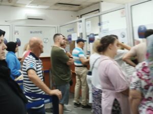 Внатре има многу луѓе. Треба ред да се исчека за ливче да подадеш низ дупката од стаклото. Па да се наредиш во друг ред и да чекаш да го кажат твоето име.