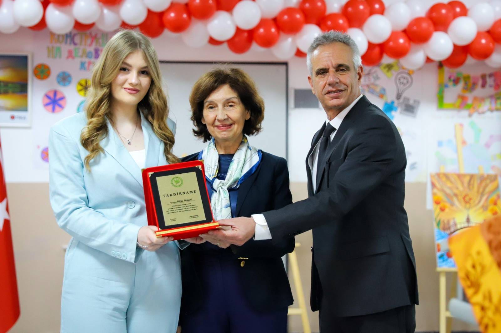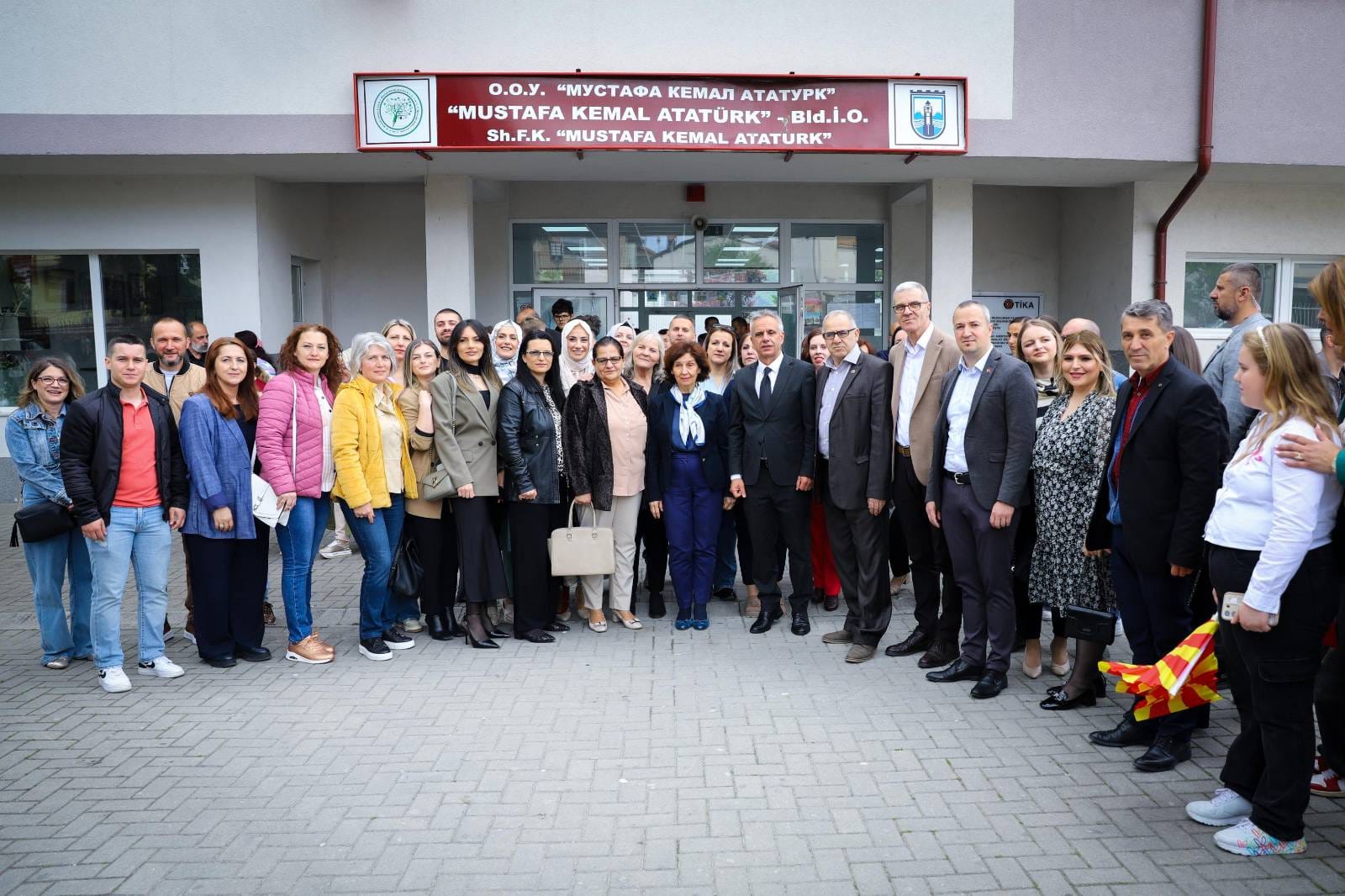 Во училиштето, со најмногу ученици од турската заедница и настава на турски, македонски и албански јазик, претседателката беше запознаена со неговиот развој, капацитети и персонал, а потем ја проследи прекрасната приредба, колаж на ора, музички точки, ораториум и рецитирање.