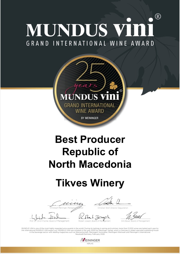 Оваа почесна титула им се доделува на производители на вино кои во текот на 25-годишната историја на Мундус вини покажале исклучителна конзистентност, врвен квалитет и извонредни резултати, позиционирајќи се меѓу најуспешните и најнаградуваните учесници во историјата на овој реномиран натпревар. Наградата е уште една силна потврда за меѓународната препознатливост на вината на „Тиквеш“, кои со години наназад освојуваат бројни признанија на најпрестижните светски натпреварувања и дегустации. Признанието „Најдобар производител – Република Македонија“ се доделува врз основа на долгогодишните резултати и медали што вината на визбата ги освоиле на Мундус вини, една од највлијателните вински манифестации во светски рамки.