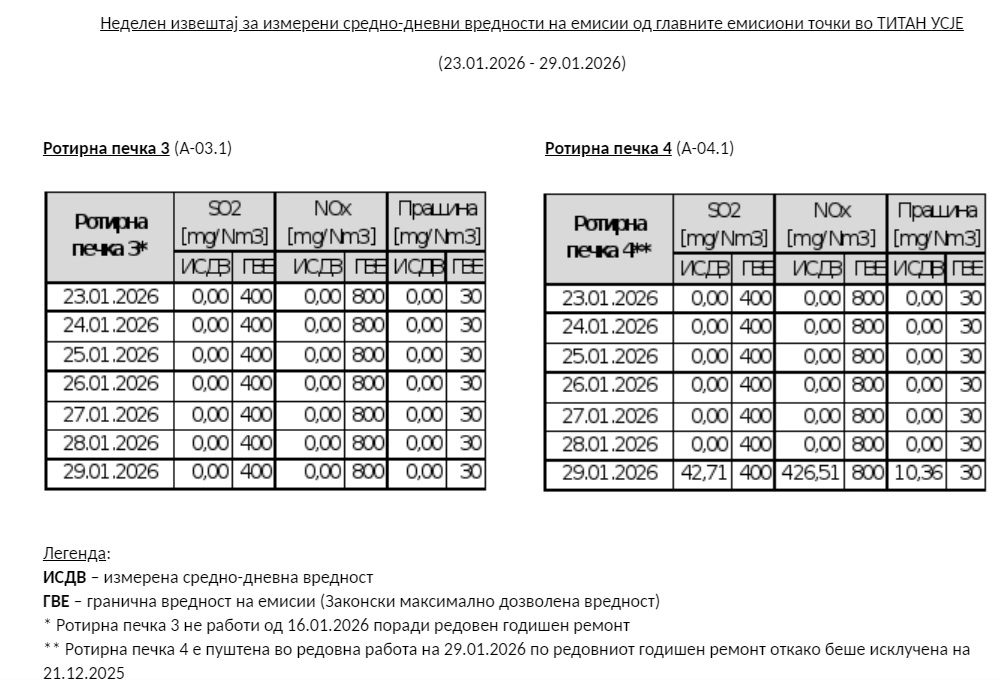 „Загадувањето во Скопје беше високо и во изминатиот период кога Титан Усје воопшто не работеше. Имено, поради редовен ремонт двете печки не работеа – едната, печка број 4, од 20 декември 2025 година, а втората, печка број 3 од 16 до 29 јануари, кога печката број 4, беше повторно вклучена, согласно работниот план. И покрај тоа што Титан Усје целосно не работеше во овој период, највисоката вредност на ПМ 10 честичките достигна и до 275 микрограми на кубен метар.