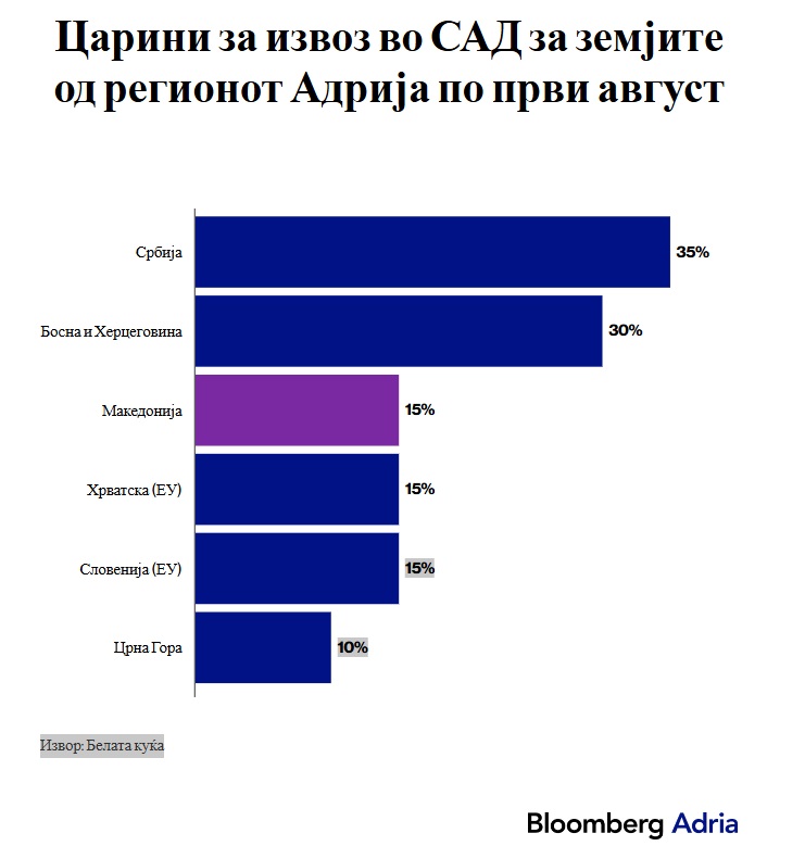 Македонија официјално има стапка од 15 отсто, исто како за Европската унија, којашто склучи трговски договор само пред три дена, на 27 јули. Првично објавената царинска стапка за македонските стоки од месец април, изнесуваше 33 отсто, што значи дека новата стапка е повеќе од двојно пониска, јави Блумберг Адриа.
