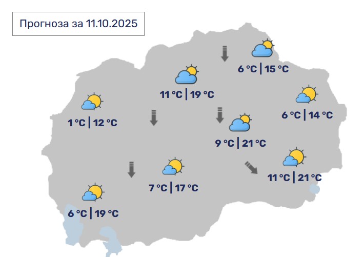Во Скопје ќе биде променливо облачно со сончеви периоди. Ќе дува умерен, повремено засилен северен ветер. Минималната температура ќе се спушти до 11, а максималната ќе достигне до 19 степени Целзиусови.