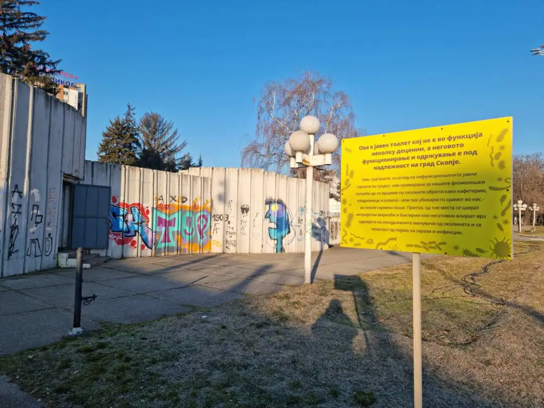 „Денеска во утринските часови на повеќе локации околу мостот „Гоце Делчев“ и во градскиот парк во Скопје, беа поставени знаци со натписи кои се однесуваат на недостатокот на јавни тоалети, горлив проблем со која се соочува граѓаните, а се во надлежност на управата на градот Скопје. За жал, јавните тоалети веќе со децении не се функционални и се без основни санитарни услови за користење. Уметникот Озбек Ајваз, со оваа акција сака да го потенцира и актуелизира барањето и потребата на граѓаните на Скопје за решавање на овој проблем за која градот се чини не нуди никакво решение“, велат организаторите на акцијата.