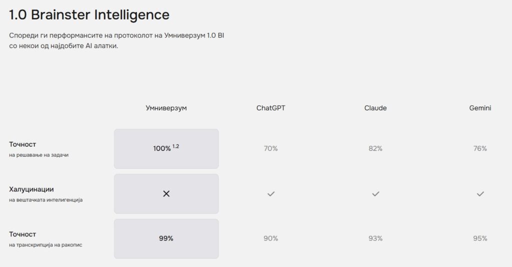 Умниверзум 1.0 Бреинстер интелигенцијата е директен одговор на овие резултати. Воедно, се работи за првиот ВИ-агент од Македонија кој користи повеќемоделен протокол за да овозможи најголема точност при решавање на математички задачи, чекор-по-чекор објаснувања и можност за натпревари – со целосна поддршка на македонски јазик.
