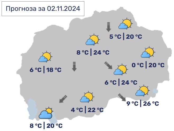 Во Скопје наутро во делови од котлината ќе има услови за појава на слаба магла, а преку денот сончево со мала до умерена облачност. Ќе дува слаб до умерен ветер од северен правец кој во делови од котлината повремено ќе засилува.