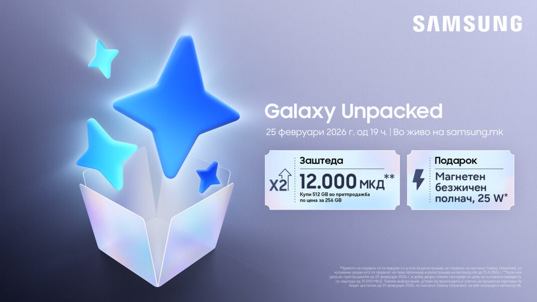Не ја пропуштајте шансата – регистрирајте се! Утре, на 25 февруари, светот ќе го види следното поглавје на мобилната интелигенција на настанот „Galaxy Unpacked“. „Samsung” ги повикува сите заинтересирани да бидат меѓу првите што ќе ги откријат овие новости. Регистрирајте се на линкот samsung.com/unpacked пред 25 февруари и како специјална поволност, при купување на еден од новите „Galaxy” уреди кои ќе ги видиме утре вечер, ќе добиете вреден ПОДАРОК: „Samsung“ магнетен безжичен полнач од 25W. Време е за