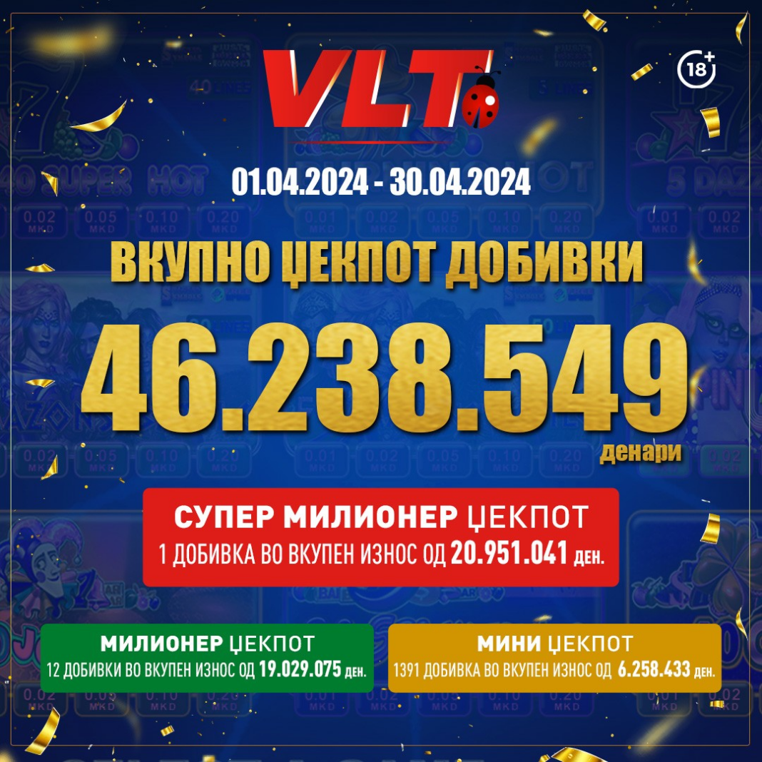 Во април имавме и 12 Милионер џекпот добивки. Играчите кои ги освоија, заедно поделија неверојатни 19.029.075 денари. Дополнително, во април играчите на ВЛТ освоија и 6.258.433 денари за Мини џекпот.