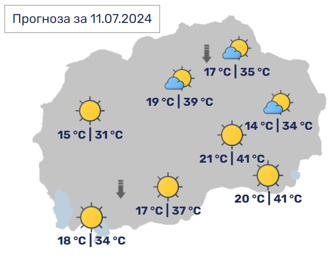 Во Скопје ќе биде сончево и многу топло, со слаб до умерен ветер од северен правец. Минималната температура ќе се спушти до 20, а максималната ќе достигне 39 степени.