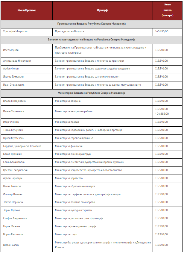 Останатите вицепремиери и министри земаат нето-плата по 115.540 денари (1.870 евра). Министерот за внатрешни работи Панче Тошковски зема дополнителни 20 отсто во износ од 24.865 денари заради извршувањето на таа функција, па неговата плата изнесува 140.405 денари.