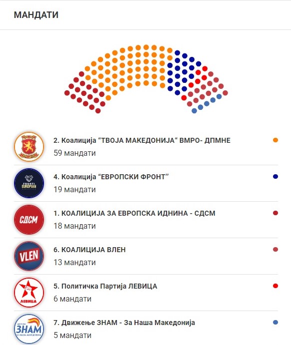 По изброени 85,66 отсто од гласачките ливчиња, ВМРО-ДПМНЕ досега има освоено 59 пратенички места, вели пресметката на сајтот на Државната изборна комисија. СДСМ според истата пресметка засега ќе има 19 пратенички места во идниот парламентарен состав.