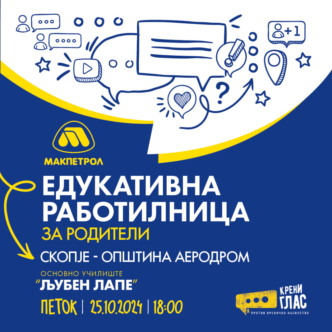 Во над 150 училишта во наведените општини, „Макпетрол“ преку кампањата „Крени глас против врсничко насилство“ овозможи работилници за ученици, а сега ќе организира вакви едукативни средби наменети за родители. Првата работилница се одржа на 5 октомври во Општина Центар, во ООУ „Јохан Хајнрих Песталоци“. Со присуство на поголем број родители, на оваа средба беа споделени знаења за булингот, се водеше интересна дискусија, а истото се очекува и во Куманово на 14 октомври.