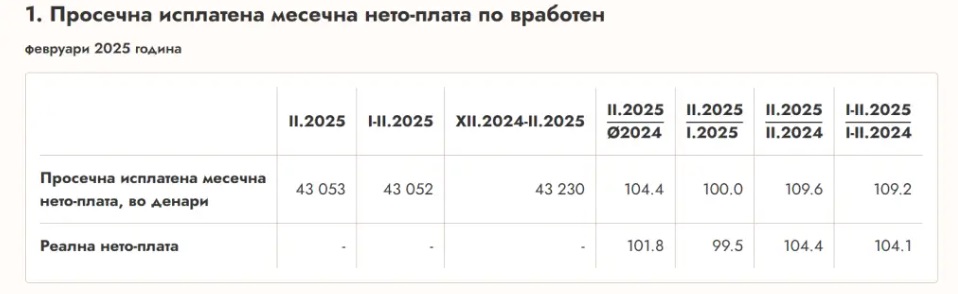 Во февруари годинава, во однос на февруари минатата година, просечната месечна исплатена нето-плата по вработен е повисока за 9,6 проценти.