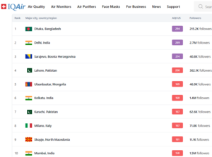 Дека не е спокојна состојбата со аерозагаденоста во Скопје покажува интернет страницата Ервижуал која на листата од 100 големи или главни градови во светот попладнево го рангира Скопје на деветото место. Во Европа позагаден воздух во моментов се дише само во Сараево.