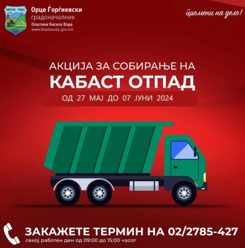 Пријавувањето почнува денеска и ќе трае до 23 мај. Секој жител на Кисела Вода кој поседува кабаст отпад и сака тој да биде подигнат и депониран на соодветна локација, ќе може да закаже термин на телефонскиот број 02/2785-427, секој работен ден од 9:00 до 15:00 часот.