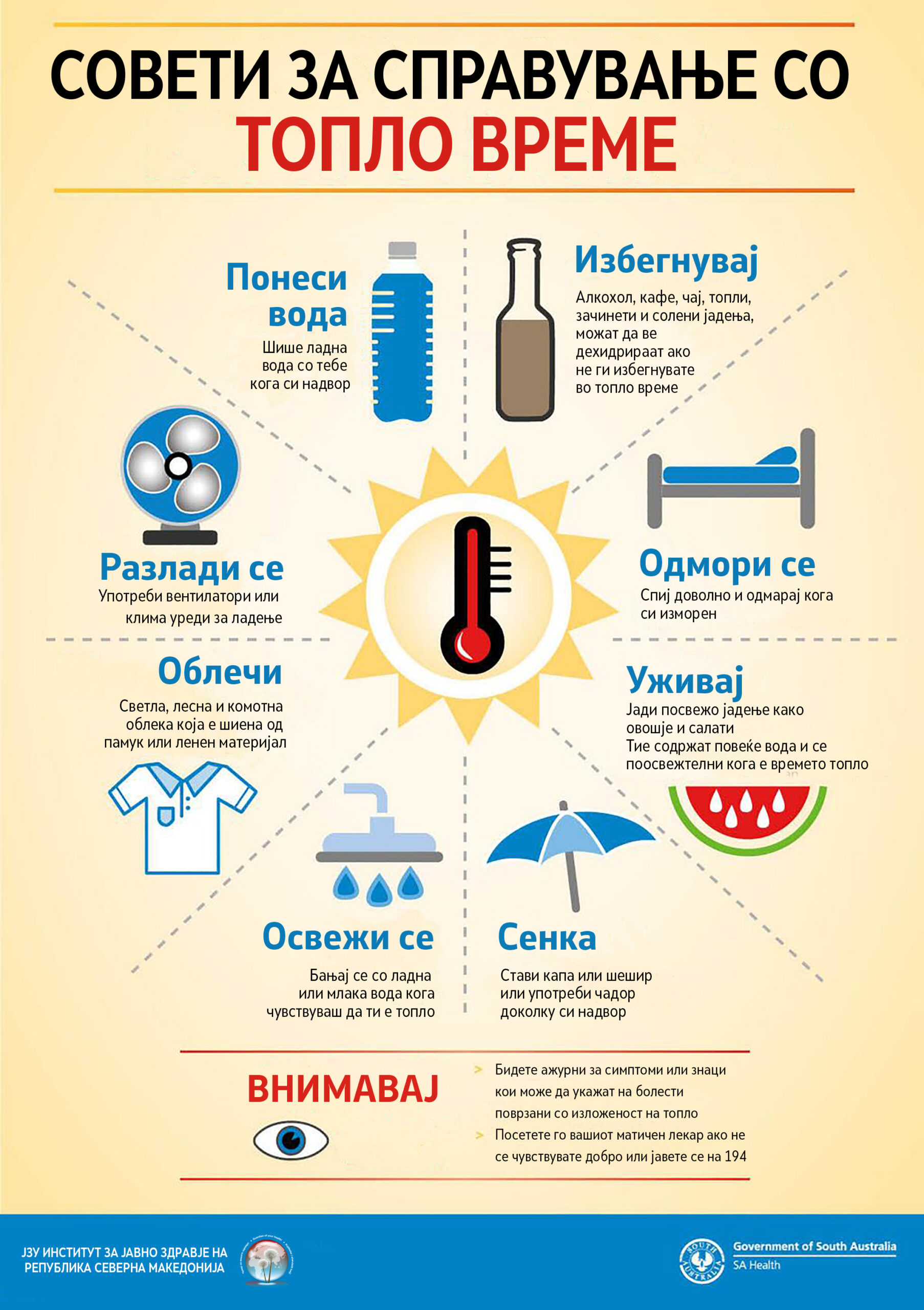 „Претпочитајте да пиете безбедна вода за пиење. Водата за пиење треба да биде без мраз, заради превенција од заразни заболувања и настинки. Носете капа со широк обод и очила за сонце со заштитен УВ фактор. Носете широка, лесна и памучна облека со светла – бела боја. Планирајте активности на отворено во поладни периоди од денот, пред 11 и после 17 часот. Одмарајте често и обидете се да останете во сенка кога сте на отворено. Ако правите напорни активности на топло, како што се планинарење или возење велосипед, обидете се да се прилагодите на надворешната температура пред таа активност со вежбање еден час дневно на топло. Ако сте во затворен простор со вклучено ладење од клима уредот, пред да излезете надвор во топла средина исклучете ја климата барем половина час пред тоа, за да полесно се адаптирате на темепературната разлика“, гласат препораките на ИЈЗ.