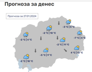 Во Скопје променливо облачно, претпладне со врнежи од слаб дожд. Ќе дува умерен до засилен ветер од северен правец. Минималната температура ќе се спушти до -1, а максималната ќе достигне до 10 степени.
