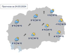 Во Скопје сончево со мала до умерена облачност. Ќе дува умерен до засилен ветер од јужен правец. Кон крајот на денот и во текот на ноќта ќе има врнежи од дожд, повремено поројни, проследени со силен ветер (над 60 km/h).